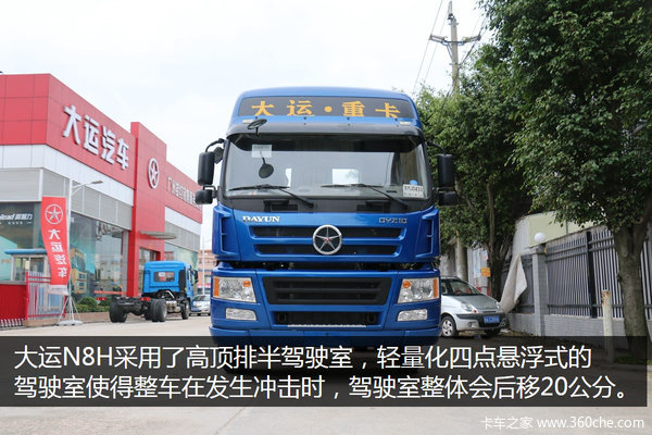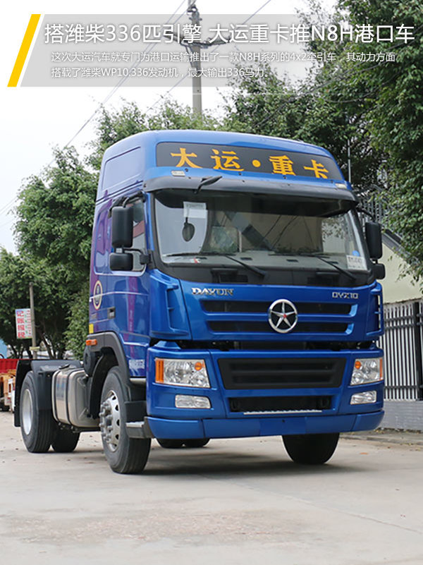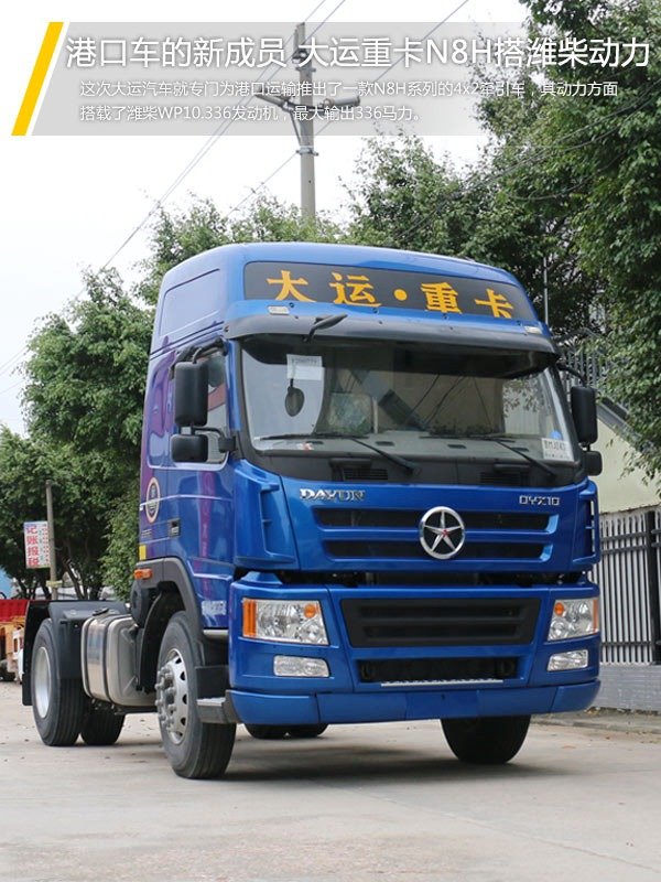 来卡车之家App【卡车之家 原创】随着国内经济的高速发展,进出口的货物量也快速的增长。而港口作为进出口货物主要的集散地,其使用的半挂运输车也越来越多。据悉,大运汽车专门为港口运输市场推出了一款N8E系列的4x2牵引车,其动力方面搭载了潍柴WP10.336发动机,最大输出功率为336马力。