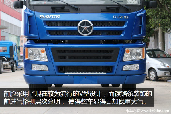 作为卡车里的年轻品牌,大运重卡的设计风格更偏向时尚流行。例如它的前脸就采用了现在较为流行的V型设计,而且蓝色和黑色搭配的前进气格栅层次分明,使得整车显得更加稳重大气。组合式设计的前照灯简洁美观。