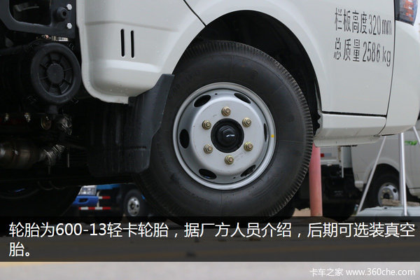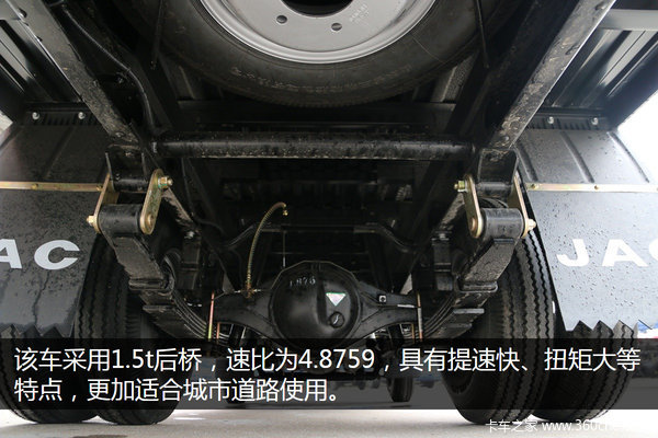 后桥为整体桥式,悬挂为钢板弹簧,该车采用1.5t后桥,速比为4.8759,具有提速快、扭矩大等特点,更加适合城市道路使用。且四轮均为鼓刹,遗憾的是并未装备ABS。