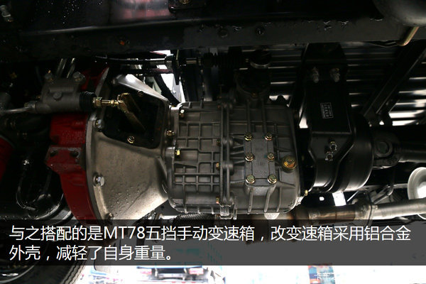 与之搭配的是MT78五挡手动变速箱,改变速箱采用铝合金外壳,减轻了自身重量。采用了国内多锥同步器技术,换档平顺舒适,有着比较高的的传动效率,技术成熟。