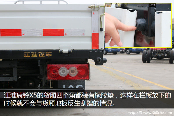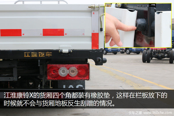 江淮康铃X5的货厢四个角都装有橡胶垫,这样在栏板放下的时候就不会与货厢地板发生刮蹭的情况。
