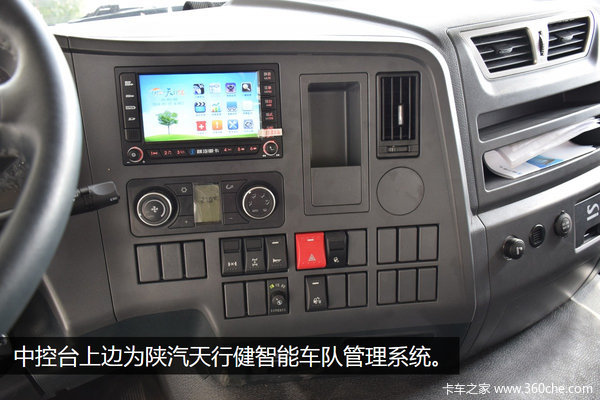 中控台靠近驾驶员一侧,方便驾驶员行车时操作。中控台上边为陕汽天行健智能车队管理系统,有视频监控、一键检测、运营管理、装载状态、维保服务等应用程序,操作简单实用。