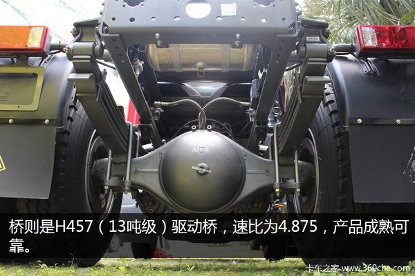 前桥采用常见的H153(5.5吨级)的车轴,承载能力强。后桥则是H457(13吨级)驱动桥,速比为4.875,产品成熟可靠。