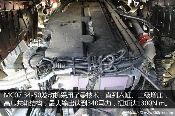 这款MC07.34-50采用了曼技术,直列六缸、双级增压,高压共轨结构,最大输出达到340马力,峰值扭矩达1300N.m,经济转速在1200rpm-1700rpm之间,发动机排量为6.87L,为典型的高转速小排量发动机,适用于良好路面标载运输,燃油经济性好。