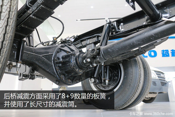 车架采用局部双层梁,布置在前桥和后桥之间,加强了轴间的支承力度。5吨级后桥则采用了8+9数量的板簧,并使用了长尺寸的减震筒。