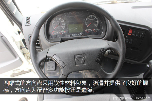 驾驶室整体采用了浅灰色配色,中控台为塑料面板,操作界面倾向主驾驶位,方便司机操作。危险警告灯、前后雾灯和驾驶室后照明灯按钮被有序安放在中控面板上。