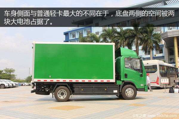 车身侧面与普通轻卡最大的不同在于,底盘两侧的空间被两块大电池占据了,由于为纯电动车型,因此并没有油箱。储气罐和24V电池放置在车辆后方的大梁右侧,气罐为刹车系统储存压缩空气,而24V的电池则是保障驾驶室内的用电器正常工作。