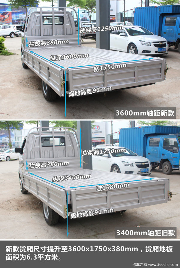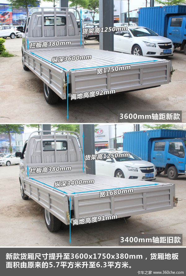 来卡车之家App【卡车之家 原创】长安跨越现售的微卡里有新豹2、新豹MINI、跨越王,跨越王也习惯被称为“新豹王”,旧款车型最大3.4米轴距。为进一步满足市场需求,跨越王新增了3.6米轴距的车型,并升级了货厢尺寸,提升了不少载货容量。