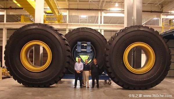 由于车身太过庞大,配备的8条轮胎规格达到了59/80r63,也是目前世界上最大的量产轮胎,4.03米的直径和5.3吨的重量让任何成年人站在它的面前也显得非常渺小,每条轮胎设计承重高达100吨。目前世界上仅普利司通、米其林和Titan三家轮胎公司可以制作出这个轮胎界巨无霸。