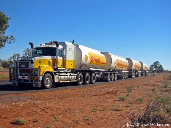 以最长的K级别 RoadTrain 为例,通常工作在澳洲偏僻地带的矿区,在单程近100公里的距离之间来回运送近500吨的货物,众多车主为了更高效的完成任务,通常除了会选择搭载 600hp、19L 的康明斯级别发动机的主牵引车之外,还会配备可提供400hp 动力的副牵引车,以此来获得总共 1000hp 的牵引力。