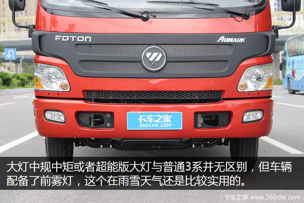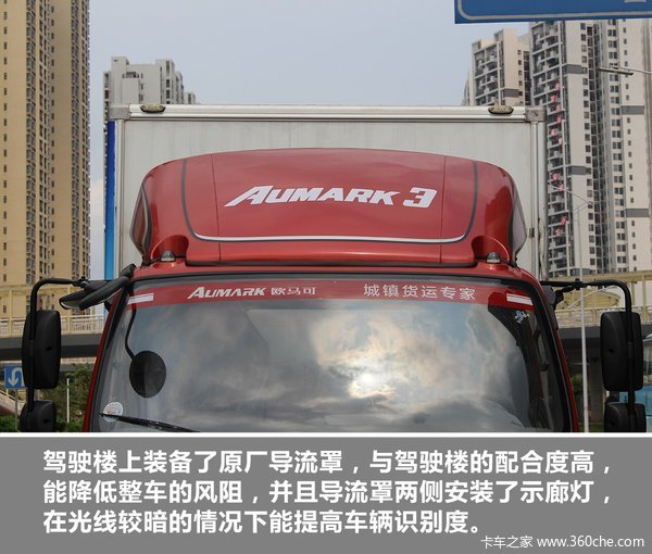 欧马可3系超能版驾驶楼上装备了原厂导流罩,与驾驶楼的配合度高,能降低整车的风阻,并且导流罩两侧安装了示廊灯,在光线较暗的情况下能提高车辆的识别度。