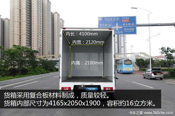 货箱采用复合板材料制成,自重较轻,对降低油耗带来一定的帮助。货箱内部尺寸为4165x2050x1900,容积约16立方米,满足城市物流运输的需求。
