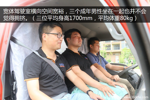 欧马可3系的驾驶室采用宽体设计,使驾驶室的横向空间比较宽裕,三个成年男性坐在一起也并不会觉得拥挤。三位模特平均身高170厘米,平均体重80kg。