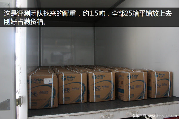 卡车之家评测团队尽量贴近真实的运输过程,于是向服务站借来了1.5吨的配重,测试该车在载重1.5吨情况下的油耗。同样载重情况也做了两次测试,载重第一次行驶的路线与空车行驶路线一样,90%高速路段,来回全程60公里,行驶时间约1个小时,测算出来的油耗为12.00L/百公里。