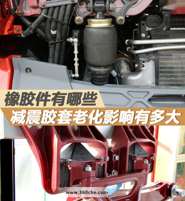 发动机支架脚垫、钢板弹簧衬套、减震脚垫这类部件橡胶老化的话,会发生异常的震动、异响,导致整个部件甚至辐射到周边部件产生损伤。另外卡车上的橡胶衬套需要更换的话,并不是一件易事,有时需要较大的动作,譬如驾驶室的减震橡胶需要更换的话就需要把驾驶室吊起。