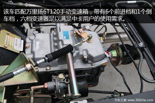 与这款上柴SC4H140Q5发动机匹配的是万里扬6档手动变速箱,型号为6T120,带有6个前进档和1个倒车档,兼顾车辆起步性和机动性,保证了高效的变速性能。