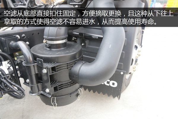 这款车的空滤管口比较大,增加了进气量,提高效率。采用立置安装的方式,方便摘取更换、不易进水,从而提高了空滤的使用寿命。