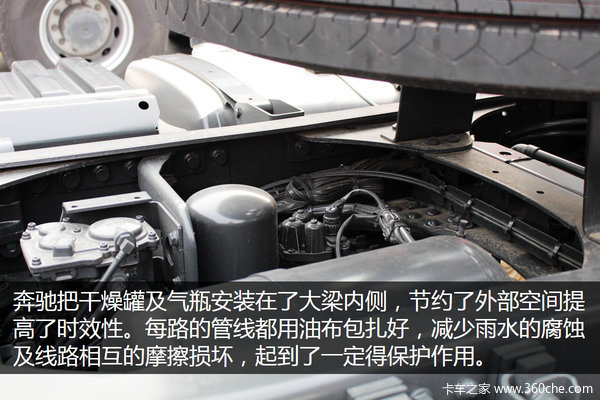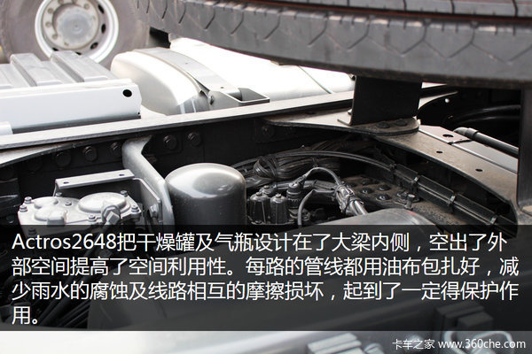 Actros2648把干燥罐及气瓶设计在了大梁内侧,空出了外部空间提高了空间利用性。每路的管线都采用整体包扎固定,减少雨水的腐蚀及线路相互的摩擦损坏,起到了一定得保护作用。