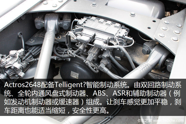 Actros2648配备奔驰研发Telligent®智能制动系统。由双回路制动系统、全轮内通风盘式制动器、ABS、ASR和辅助制动器(例如发动机制动器或缓速器)组成。系统极为迅速地传递每个制动器信号,显著快于任何机械系统。这也使制动力能够像在轿车中一样灵敏地计量。制动力按照载荷在牵引车和挂车或半挂车之间进行最佳分配。Telligent®智能制动系统也确保不同车桥的制动衬块不会出现显着不同的磨损率。