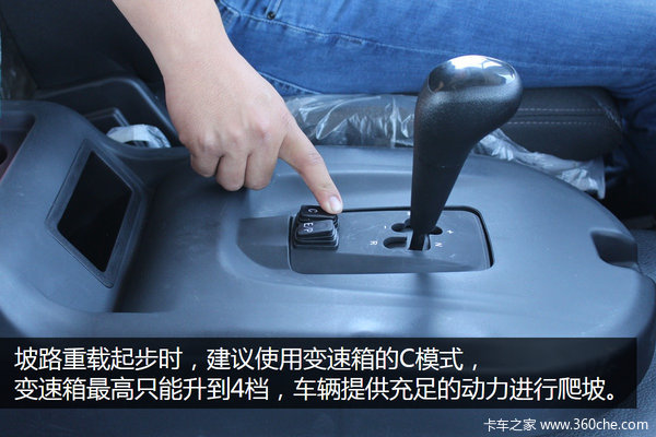 坡路重载起步的时候,建议使用变速箱的C模式,按下C键后,变速箱的进入爬坡模式,该模式下变速箱最高只能升到4挡,重载爬坡的时候可以使用。