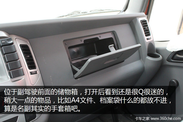 再看位于副驾驶前面的储物箱,打开后发现空间很小,比如档案袋,文件什么的稍大一点物件都放不进去。或许这就是很Q很迷你的手套箱。那么,储物空间在哪?且看下图。