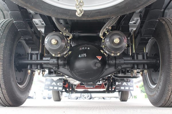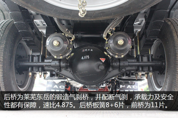 莱芜东岳的锻造气刹桥,并配断气刹,承载力有保障,速比4.875。据经销商说是3.5T五十铃加强型后桥,不知道五十铃和莱芜什么关系。后桥板簧8+6片,前桥为11片,看这情形承载能力非常可以。