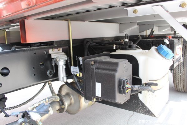 满足国五,同样采用的是SCR后尾气处理技术,但是因为尿素具易光解和腐蚀的特性,现在基本都已经更换为黑色高密度聚乙烯材料的容纳箱了,尿素喷射控制单元,根据发动机转速,氮氧化合物浓度等多个传感器的数据精确控制尿素的喷射量,由于是气推方式,所以在气路上还加有油气分离装置,以保证系统的正常工作和使用寿命。