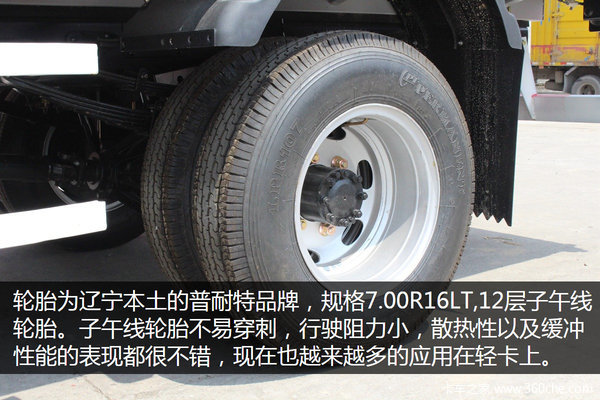 轮胎使用的是辽宁本土的普耐特品牌,7.00R16LT,12层速度级别为“N”的子午线轮胎。子午线轮胎不易穿刺,行驶阻力小,散热性以及缓冲性能都很不错,也越来越多的被应用在卡车上了。