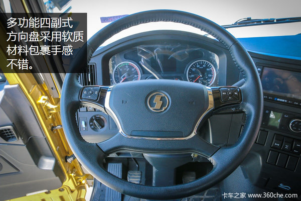 多功能方向盘采用软质材料包裹,握感还不错,上方集成音量控制开关、接、关听电话按扭、以及定速巡航开关,方便司机在行车中过程操作,提高安全性。主驾驶左侧集成电加热后视镜、左右后视镜调节、中控门锁和电动窗,陕汽配置也越来越倾向于轿车化了,非常贴心。