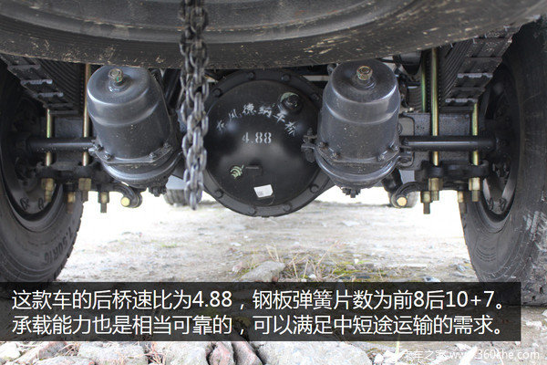 这款车的后桥速比为4.88,钢板弹簧片数为前8后10+7。承载能力也是相当可靠的,可以满足中短途运输的需求。