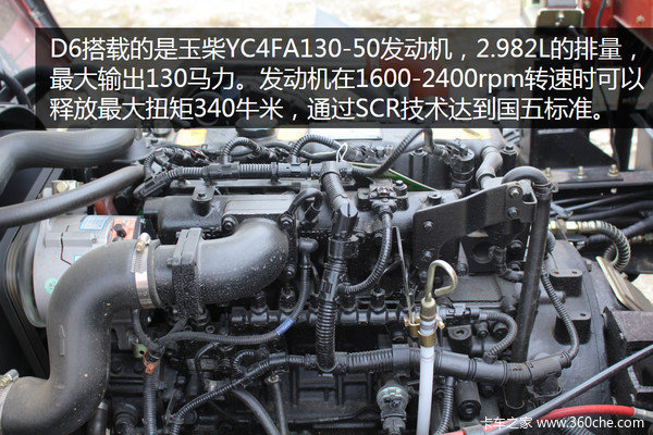 D6搭载的是玉柴YC4FA130-50发动机,2.982L的排量,最大输出130马力。发动机在1600-2400rpm转速时可以释放最大扭矩340牛.米,通过SCR技术达到国五标准。
