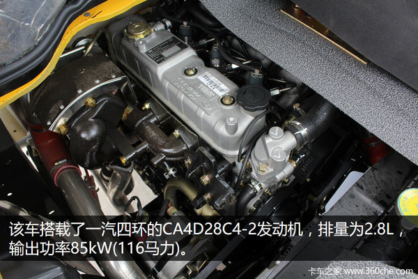 该车搭载了一汽四环的CA4D28C4-2发动机,排量为2.8L,输出功率85kW(116马力),这款发动机采用了五十铃的4JB1T发动机的技术打造,技术成熟可靠性高。