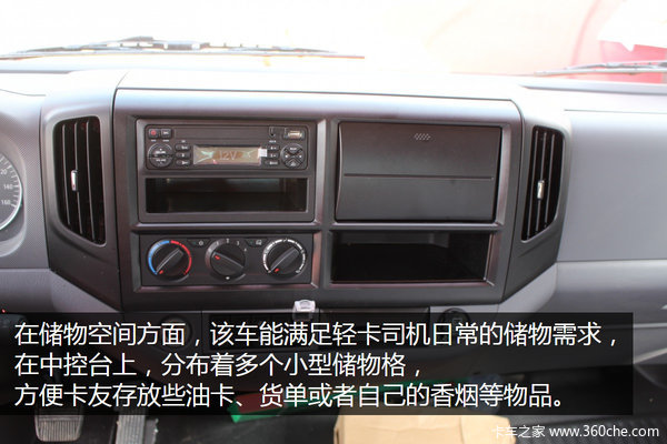 在储物空间方面,该车能满足轻卡司机日常的储物需求,在中控台上,分布着多个小型储物格,方便卡友存放些油卡、货单或者自己的香烟等,在副驾驶处还有个较大的储物格。