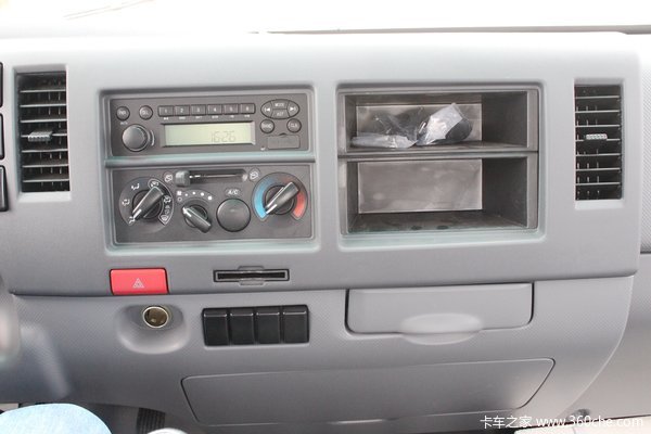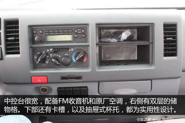 中控台有乘用车一体式设计的感觉,FM收音机带有USB和AUX接口,娱乐以及便利性更高,并且原厂配备空调。下部带有路桥费卡槽,属于实用的设计。