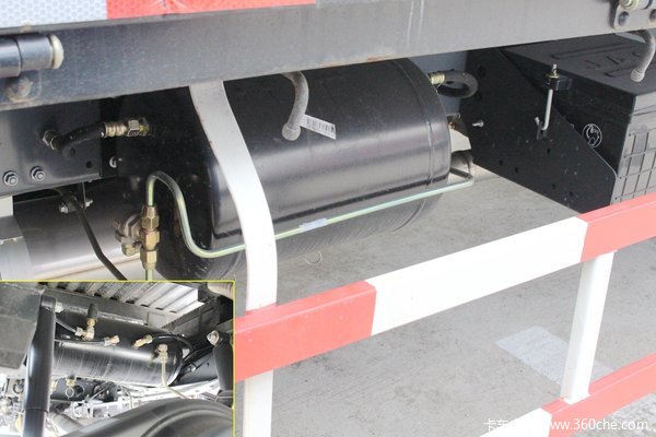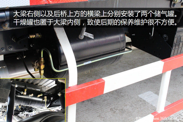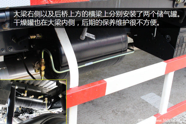 大梁右侧安置储气罐一枚,其实还有一储气罐位于后桥上方的横梁上。干燥罐也装配在大梁内侧,这种布置其实对日后的保养维护,遗留下不小的麻烦。
