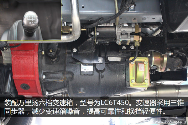 该车装配六安LC6T450变速箱,采用三锥同步器,减少变速箱噪音提高可靠性,离合器采用气推助力换挡也更轻便。
