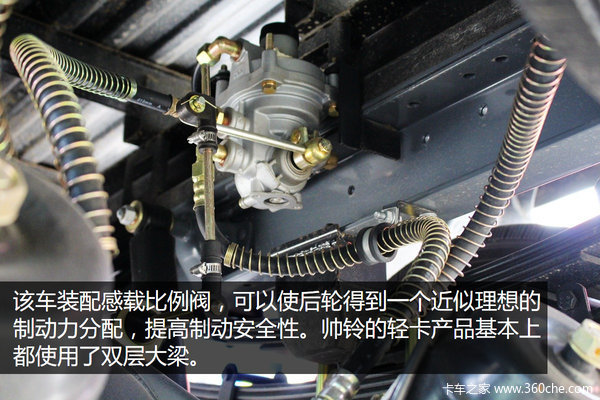 该车装配感载比例阀,可以在任何载荷条件下,使后轮都能得到一个近似理想的制动力分配,提高制动安全性。帅铃H系列轻卡产品,已全部使用双层大梁。