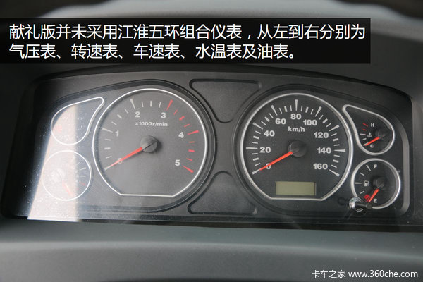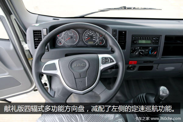 帅铃献礼版在内饰方面,舒适化仍然是帅铃的主打,精准配置后的献礼版更加注重实用化。帅铃采用优质隔音降噪设计,驾驶室密封性好。在人性化方面,仍然保证多功能方向盘、江森自控座椅、安全带高度可调、中控锁、原厂空调、MP3娱乐系统、天窗、多方位储物格配置。减去定速巡航功能,选装电动门窗,在基本不影响舒适性的情况下,降低成本。