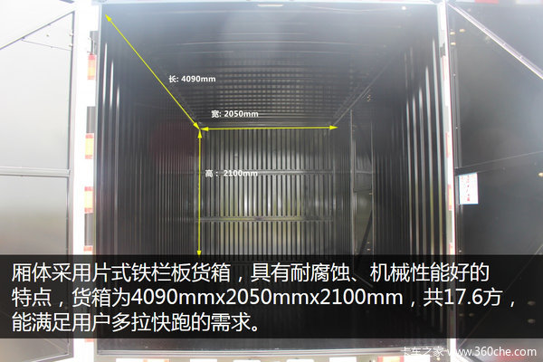 厢体采用片式铁栏板货箱,具有耐腐蚀、机械性能好的特点,货箱为4090mmx2050mmx2100mm,可达17.6方,能满足用户多拉快跑的需求。