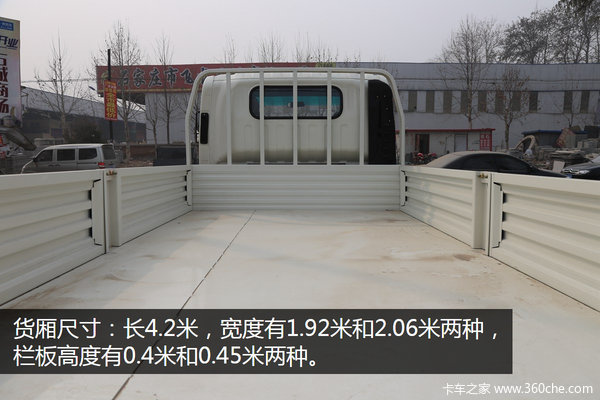 凯捷整车长度5.995米,轴距3.3米,是标准的轻卡尺寸。单排车型拥有4.2米的货厢长度,加强钣金让货厢更加结实耐用。