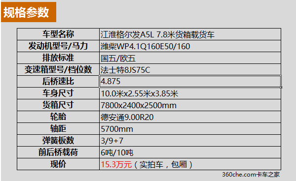 总体而言,这台实拍车上装了7.8米长的货箱,但是动力方面只有160马力,对于这个级别的车型来说稍微有点小,它比较适合轻抛货物的快递运输。但是它的排放采用了高压共轨+放气阀增压器+催化消声器+氨捕捉器技术,满足国五排放标准,而且它的价格相对来说并没有增加,是一款不错的产品。(文/洪登强 图/李桂鑫)