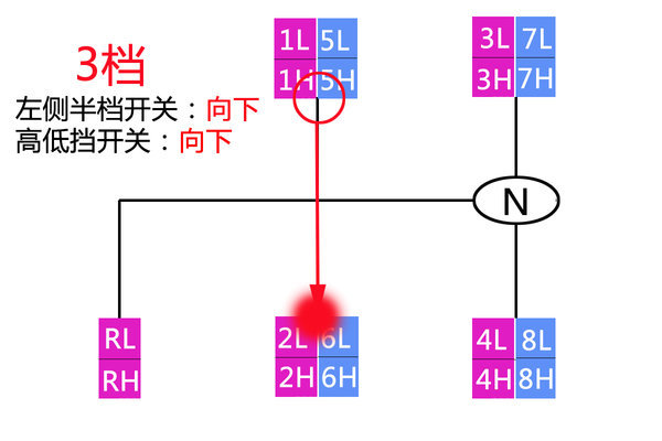 2挡进3档:前面的高低挡开关仍然处于向下位置,而此刻从2档进3档仅需拨动半档开关,踩离合拉动档杆即可完成档位切换。