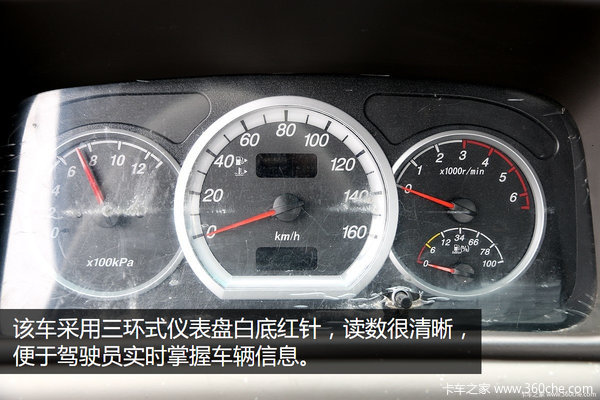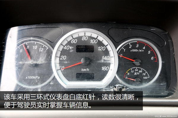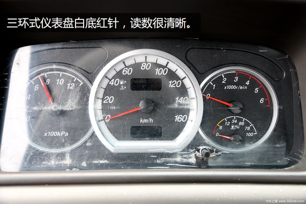 该车采用三环式仪表盘白底红针,读数很清晰,便于驾驶员实时掌握车辆信息。