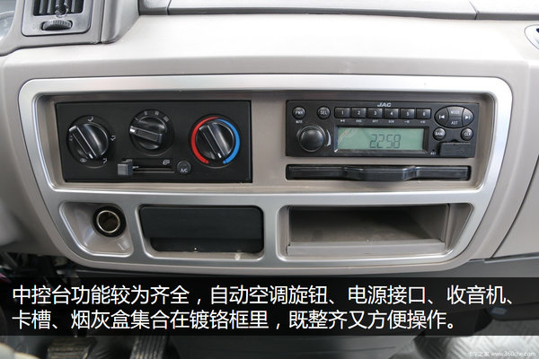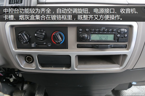 中控台功能较为齐全,自动空调旋钮、电源接口、收音机、卡槽、烟灰盒集合在镀铬框里,既整齐又方便操作。