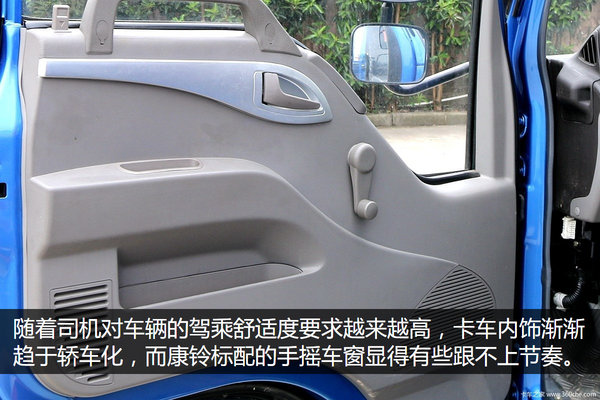 随着司机对车辆的驾乘舒适度要求越来越高,卡车内饰渐渐趋于轿车化,而康铃标配的手摇车窗显得有些跟不上节奏。