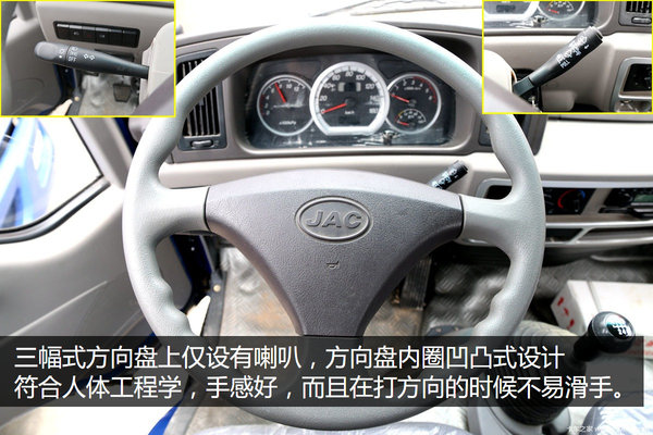 三幅式方向盘内圈凹凸式设计符合人体工程学,手感好,而且在打方向的时候不滑手。方向盘两边设有大灯、转向灯、雨刷和玻璃清洁开关,操作很方便。
