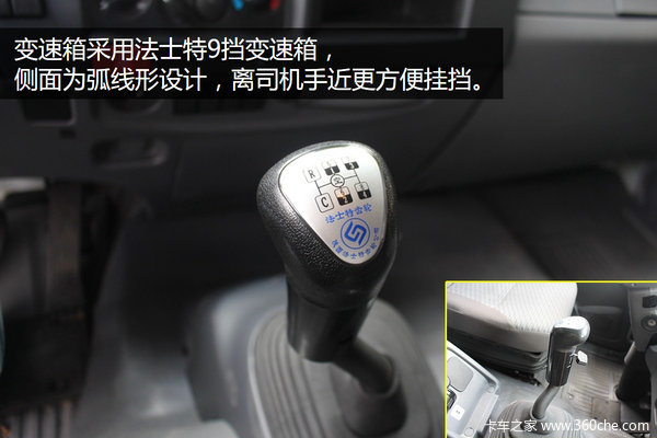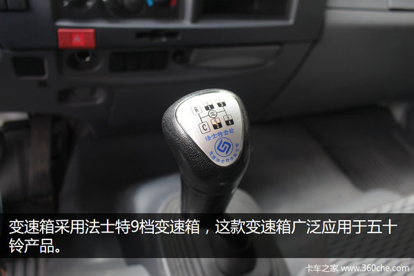 变速箱采用法士特9JS150TA-B 9挡变速箱,侧面设计满足人机工程学,使得挡杆更靠近司机,易于挂挡十分人性化。这款变速箱广泛应用于五十铃产品,保养维护起来比较方便。后桥速比为5.571,轮胎使用成山轮胎,规格为11.00R20。