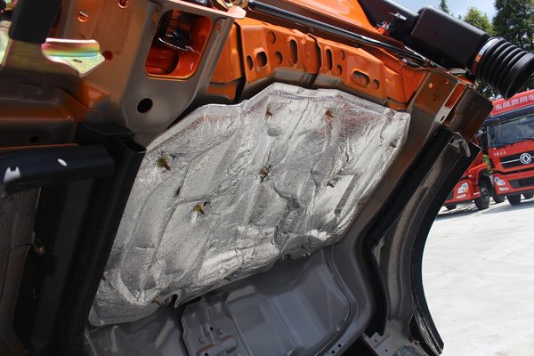 驾驶室底部靠近发动机的地方,有隔热处理,减少发动机向驾驶室传递的热量。