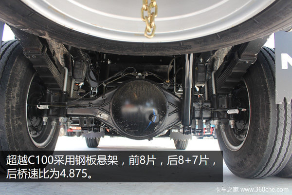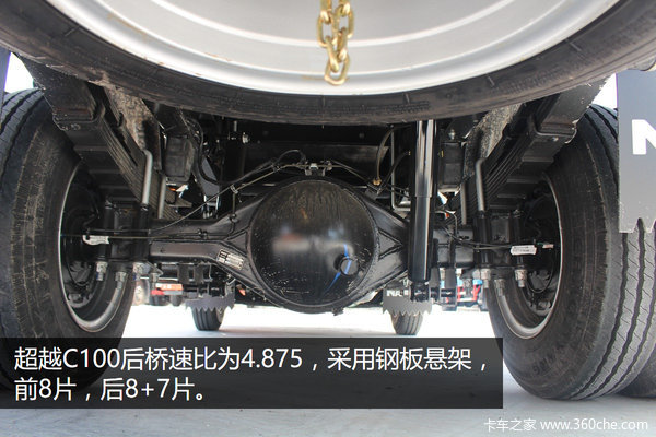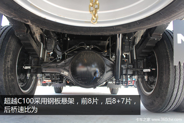 超越C100采用南京依维柯原厂后桥,载重能力强,速比为4.875,并采用加强型板簧,形式为前8片,后8+7片。
