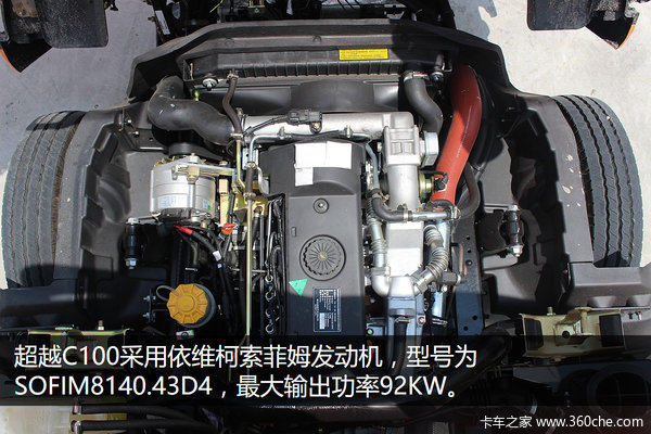 超越C100采用依维柯索菲姆发动机,型号为SOFIM8140.43D4,最大输出125马力,在转速为1600到2400转时输出最大扭矩320N.m。